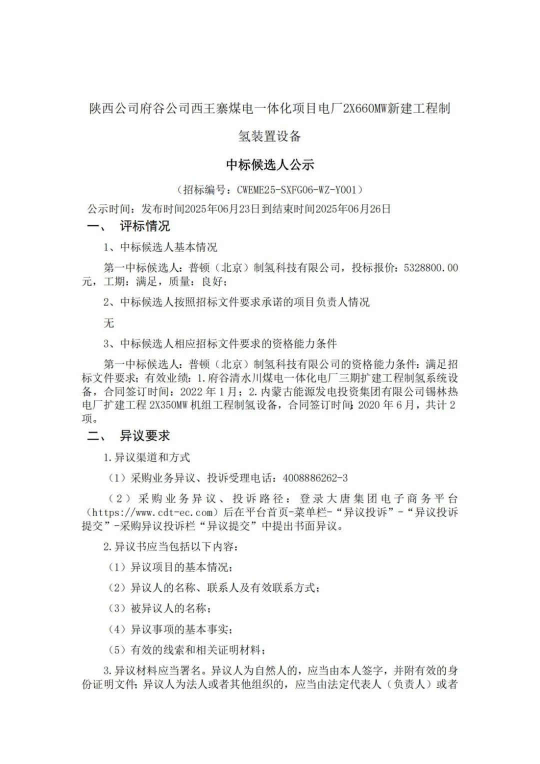 氢能汇获悉,6月23日,陕西公司府谷公司西王寨煤电一体化项目电厂2x660mw新建工程制氢装置设备中标候选人公示。