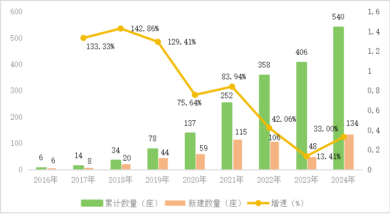2015年之前,我国只有北京氢能示范园加氢站、上海安亭加氢站、郑州宇通加氢站等少数几个加氢站。随着国内燃料电池汽车产业的加速发展,叠加中央财政补贴的大力支持,各地加氢站建设也持续增长。截至2024年,中国加氢站累计建成540座,新建134座,累计同比增长33%。
