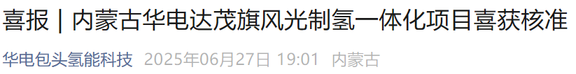 氢能汇获悉,6月27日,内蒙古华电达茂旗风光制氢一体化项目获得核准。达茂旗100万千瓦风光制氢及输氢管道项目是内蒙古批复的首个风光制氢配套纯氢管道项目,得到了自治区和包头市两级党委、政府的大力支持,该项目风电70万千瓦、光伏30万千瓦。