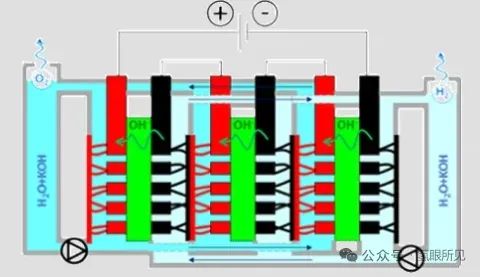 共用回路(mixed loop)挑战:反应后,电极处的气-液混合物分别进入独立的阴极和阳极分离器进行气液分离。若分离后的电解液再混合再循环(共用回路):
