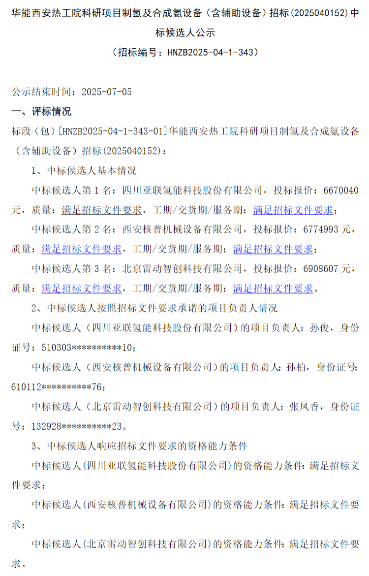 氢能汇获悉,7月2日,华能西安热工院科研项目制氢及合成氨设备(含辅助设备)招标(2025040152)]候选人公示。