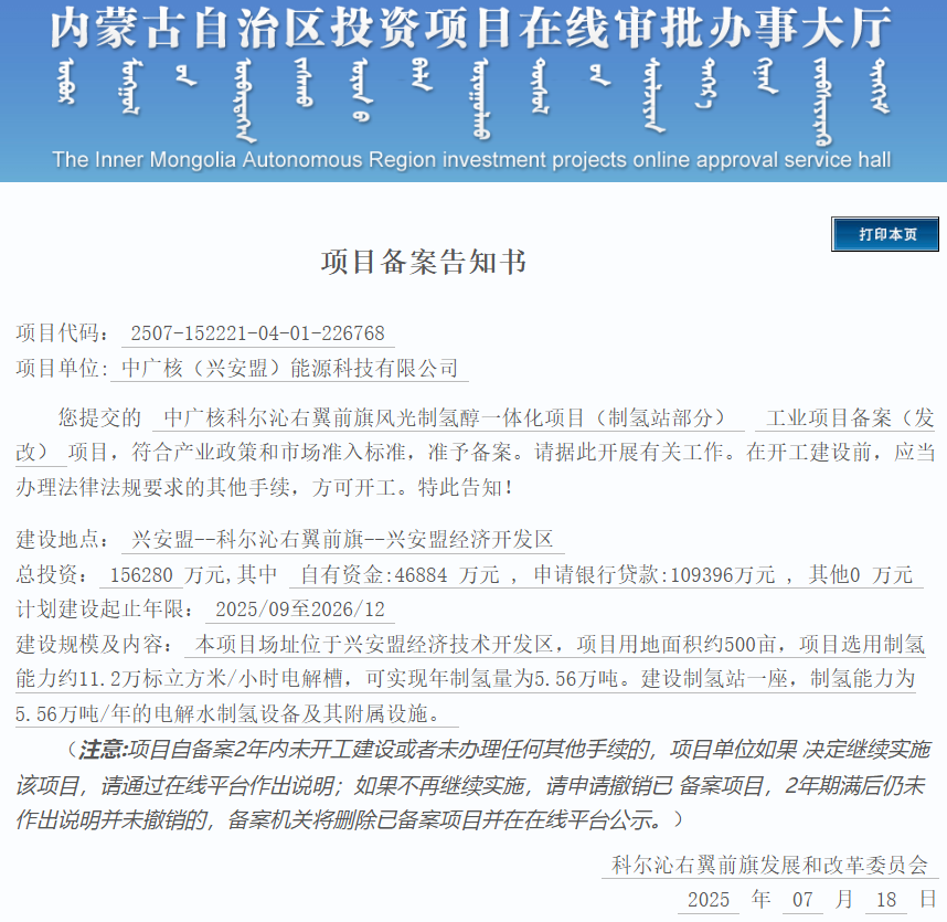 氢能汇获悉,7月21日,中广核太阳能开发有限公司海南区风光制氢一体化项目(制氢部分)、中广核科尔沁右翼前旗风光制氢醇一体化项目(制氢站部分)获备案,项目总投资合计189712.27万元。