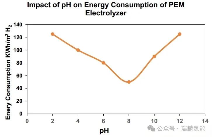 ph值还直接影响能耗。在pem电解槽中,最佳ph范围通常在7-9之间,因为ph值影响电解液电导率:ph过高可能损伤膜结构,导致能耗上升;ph过低则降低导电性,并引发膜干涸问题,从而增加能耗。实验数据表明,ph为8时能耗最低(约45kwh/m? h?),偏离此值能耗均上升。