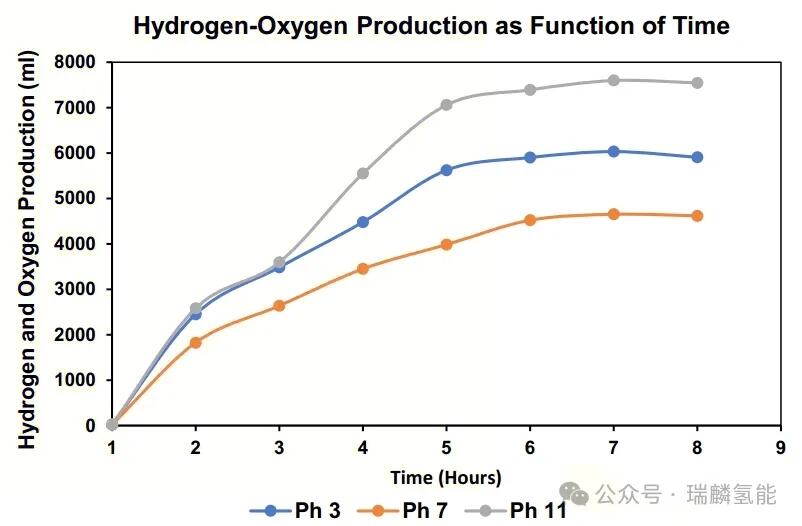 ph值是影响氢气生产效率的核心因素。随着ph值变化,氢气和氧气的生成速率会相应波动。实验结果显示,当ph值从3升至7时,产气量下降,表明中性环境可能减缓电解过程;但ph值升至11时,产气量显著增加,提示碱性条件有利于氢气生成。