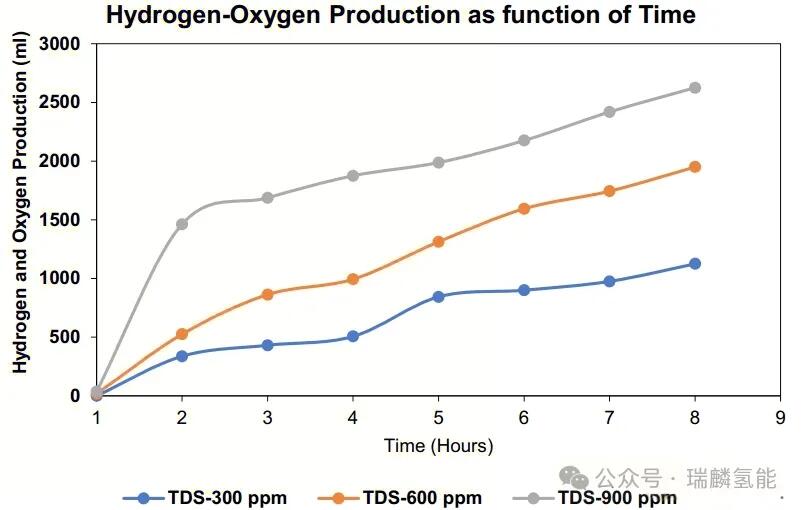 tds指水中溶解的无机和有机物总浓度,是评估水质的关键指标。实验测试了低(300ppm)、中(600ppm)和高(900ppm)三个tds水平,结果显示产气量随tds浓度增加而上升,高tds可能充当催化剂促进氢气形成。相反,低tds水平产气量有限,tds为零时无氢气产出,这与现有研究一致。