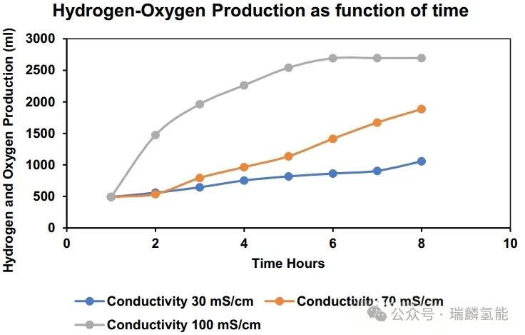 电导率是另一个重要参数,反映水中离子浓度。高电导率可降低阳极氧还原反应(oer)的过电位,减少能源需求,但过高值会增加膜恶化风险和泵送能耗。实验在电导率30ms/cm、70ms/cm和100ms/cm下进行,结果与多项研究相符:电导率上升促进氢气产量。