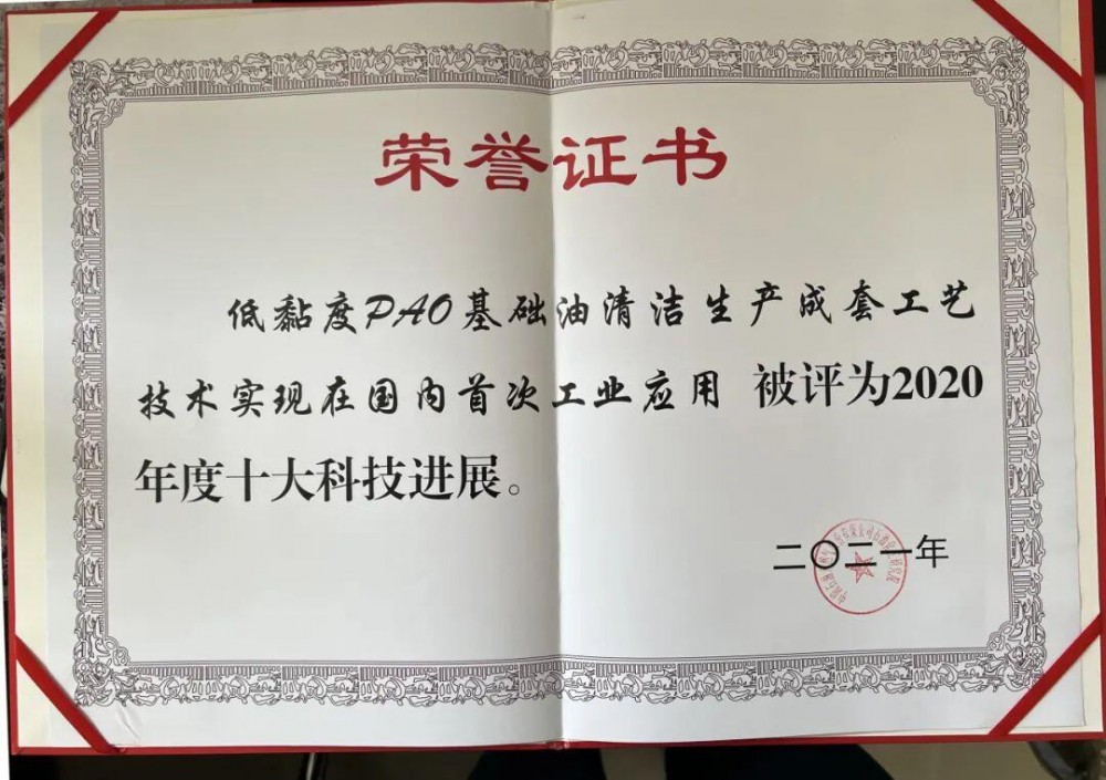 2021年12月,5000吨/年低粘度pao基础油工业试验装置的开车生产成功,低黏度pao产品各项性能均达到国外同类产品技术水平,该项技术入选中国石油2021年十大科技进展。一年后,低粘度pao基础油生产装置通过国家科技部组织验收。