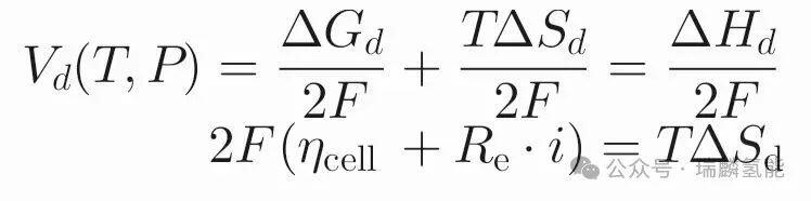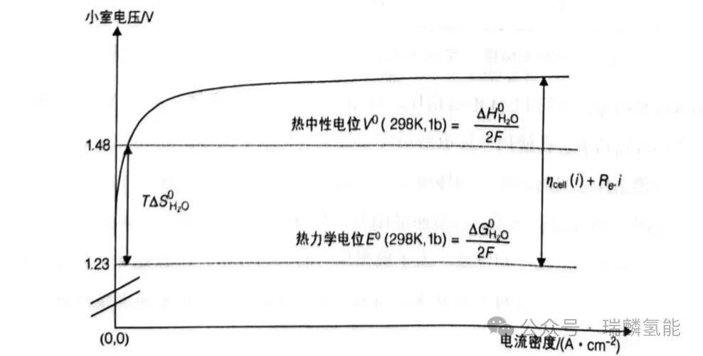 (式中 η_cell 为过电位总和, re 为总欧姆电阻,i 为电流密度)时,将不需要从环境中吸热来维持反应。该点电压v_d(t, p) 在常温常压条件下约为1.48v(对应焓变 δh)。此时,电输入的能量恰好覆盖整个反应过程(包含吸热的δg部分和吸热的tδs热需求)所需的能量,电解槽在热力学上达到不吸不散热的中性状态。