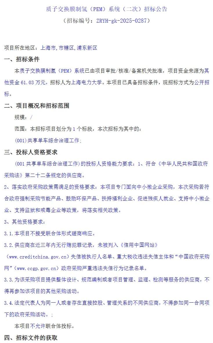 同日,质子交换膜制氢(pem)系统(二次)启动招标,招标人为上海电力大学,本次招标为其中的共享单车综合治理工作。