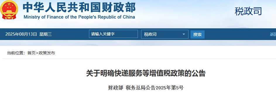 能源圈获悉,8月13日,财政部发布《关于明确快递服务等增值税政策的公告》。