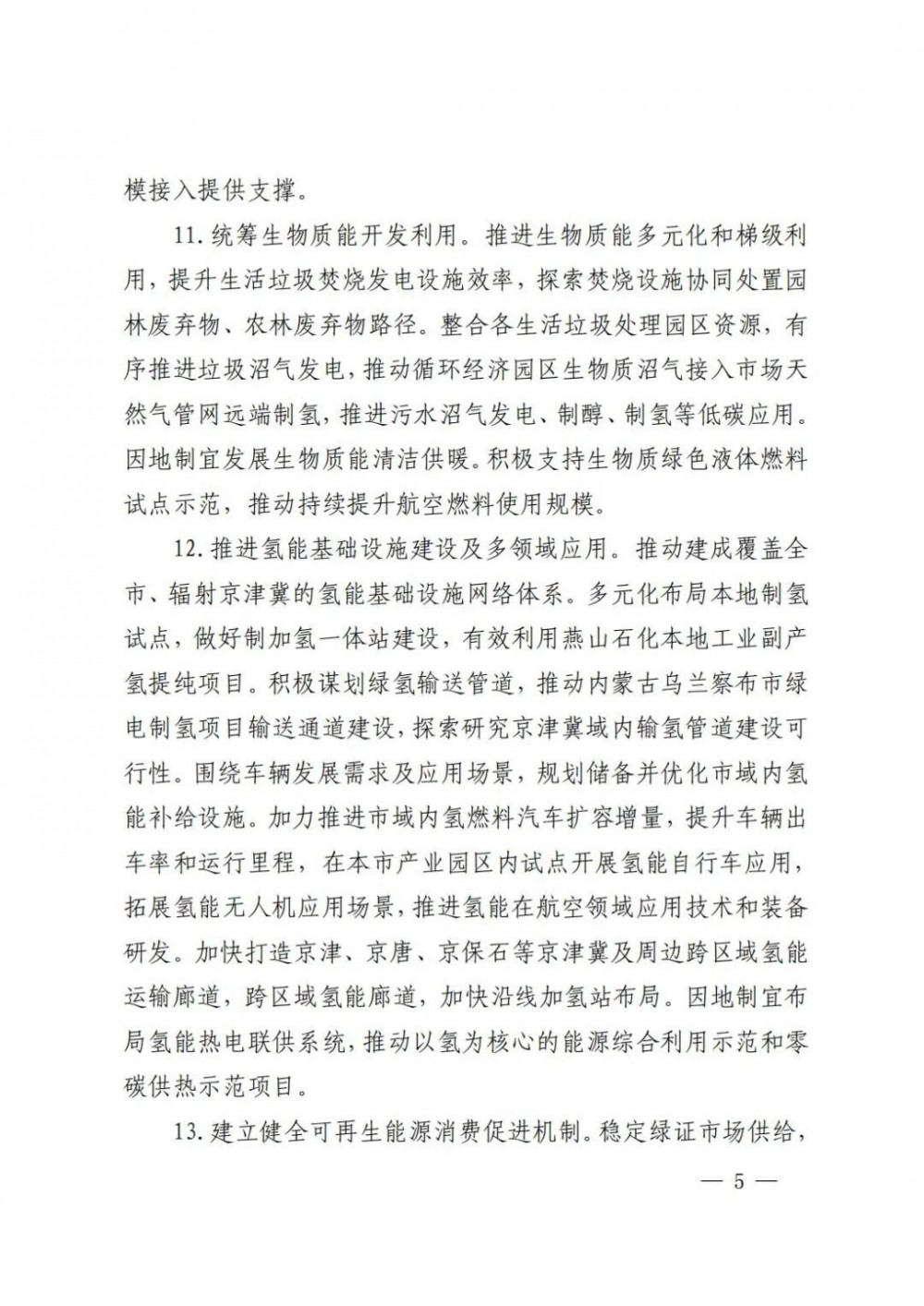 文件指出,推进氢能基础设施建设及多领域应用。推动建成覆盖全市、辐射京津冀的氢能基础设施网络体系。多元化布局本地制氢试点,做好制加氢一体站建设,有效利用燕山石化本地工业副产氢提纯项目。积极谋划绿氢输送管道,推动内蒙古乌兰察布市绿电制氢项目输送通道建设,探索研究京津冀域内输氢管道建设可行性。围绕车辆发展需求及应用场景,规划储备并优化市域内氢能补给设施。