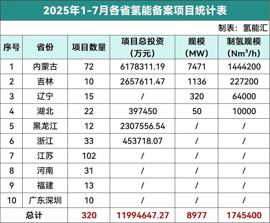 能源圈根据公开信息不完全统计,2025年1-7月全国各省完成备案的氢能项目共计320个,投资总计11994647.27万元(约1199.46亿元),规模总计8977mw,制氢规模总计1745400nm³/h。