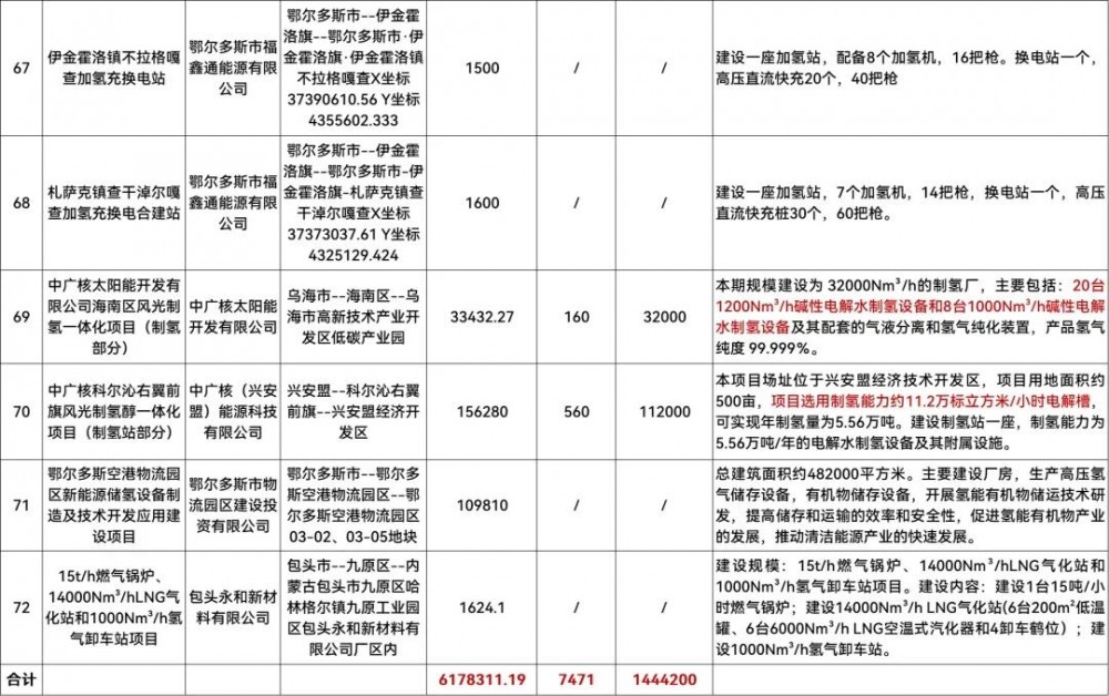 内蒙古氢能备案项目72个,项目投资合计为6178311.19万元,规模总计7471mw,制氢规模总计1444200nm³/h。