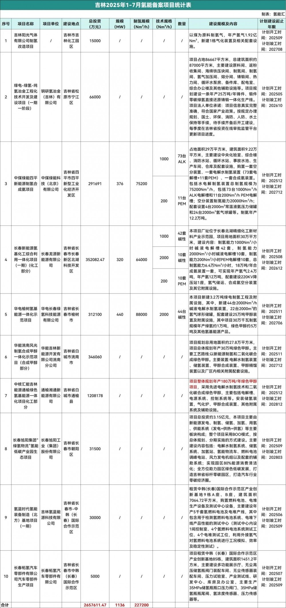 吉林氢能备案项目13个,项目投资合计为2657611.47万元,规模总计1136mw,制氢规模总计227200nm³/h。