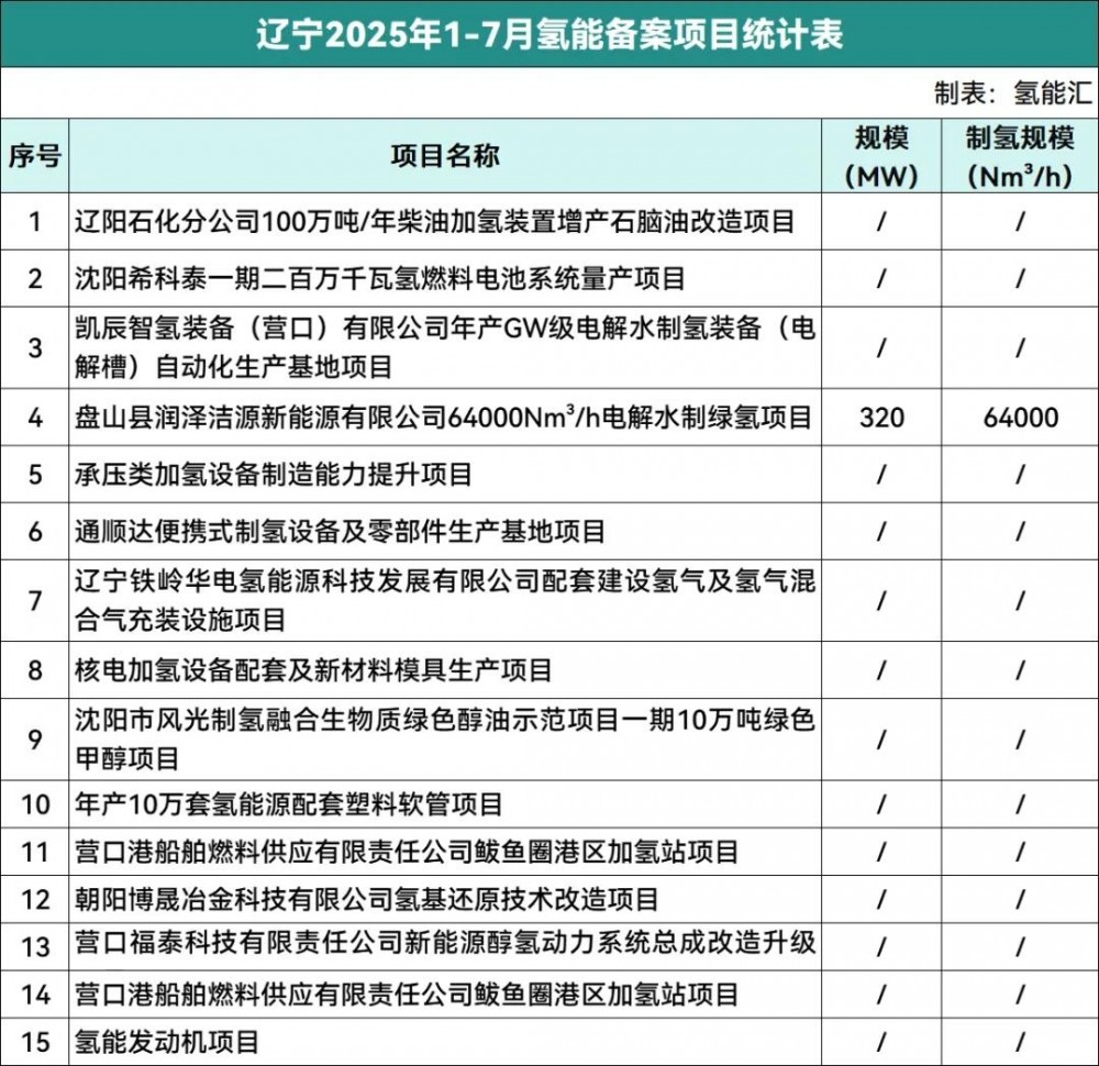 辽宁氢能备案项目15个,规模总计320mw,制氢规模总计64000nm³/h。