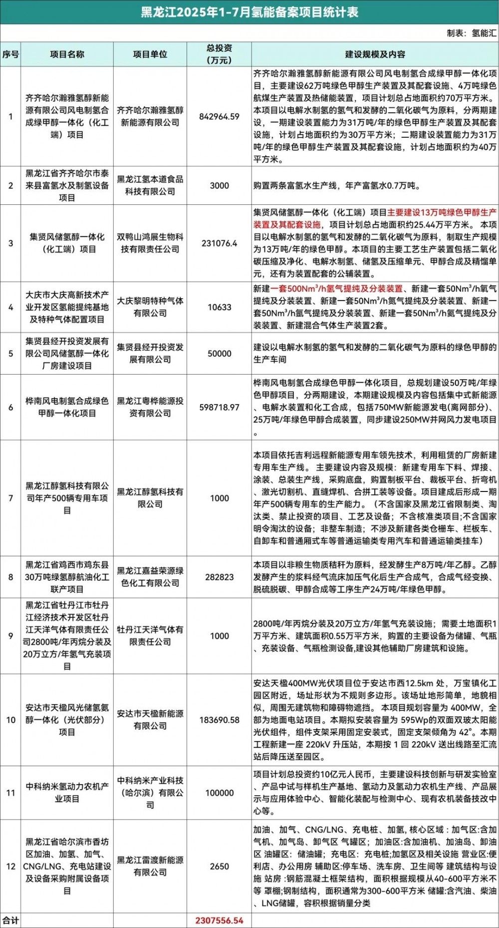 黑龙江氢能备案项目12个,项目投资合计为2307556.54万元。