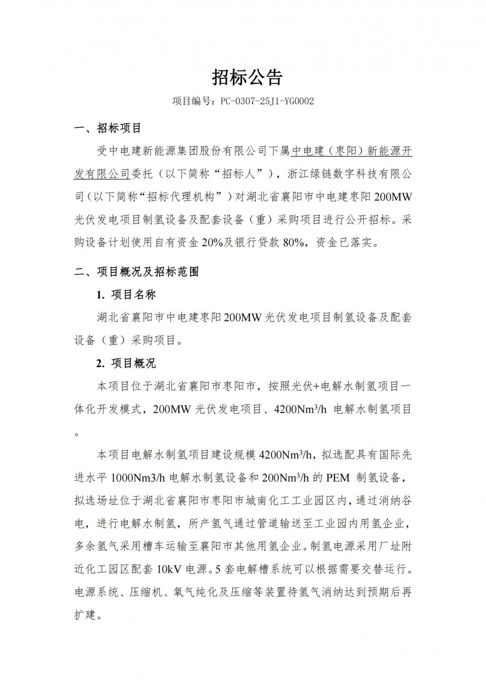 8月19日,中国电建湖北省襄阳市中电建枣阳200mw光伏发电项目制氢设备及配套采购公开招标公告。