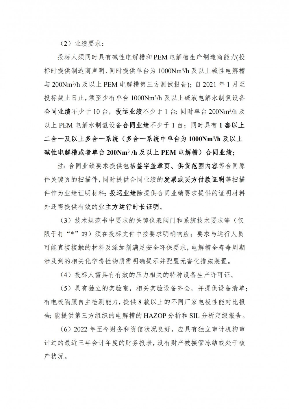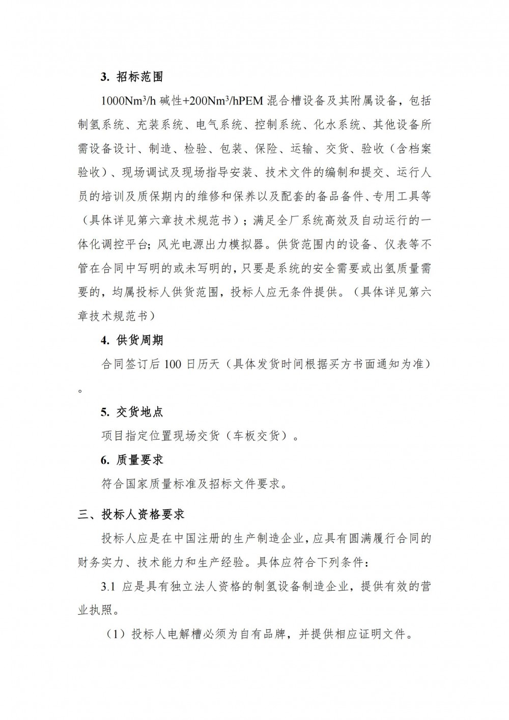 招标范围:1000nm³/h碱性 200nm³/hpem混合槽设备及其附属设备,包括制氢系统、充装系统、电气系统、控制系统、化水系统、其他设备所需设备设计、制造、检验、包装、保险、运输、交货、验收(含档案验收)、现场调试及现场指导安装、技术文件的编制和提交、运行人员的培训及质保期内的维修和保养以及配套的备品备件、专用工具等;满足全厂系统高效及自动运行的一体化调控平台;风光电源出力模拟器。供货范围内的设备、仪表等不管在合同中写明的或未写明的,只要是系统的安全需要或出氢质量需要的,均属投标人供货范围,投标人应无条件提供。
