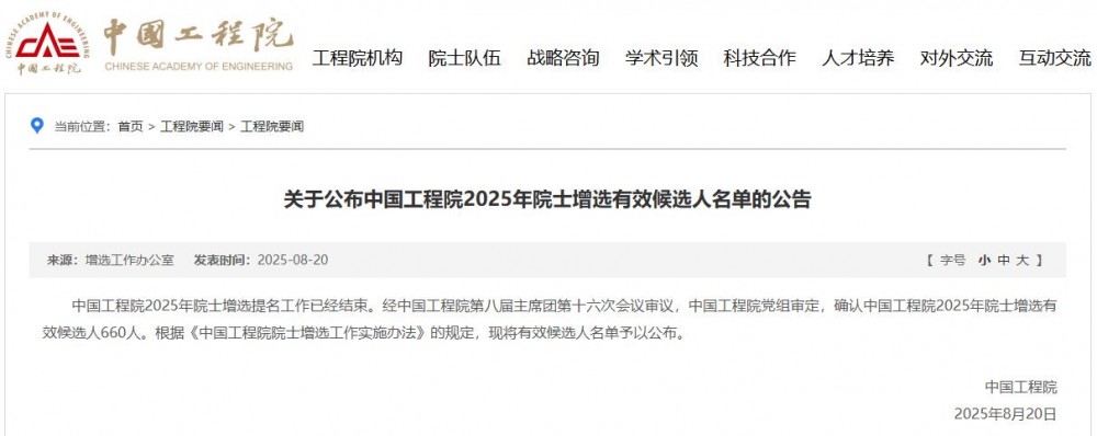 能源圈获悉,8月20日,中国工程院发布《关于公布中国工程院2025年院士增选有效候选人名单的公告》。