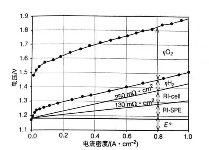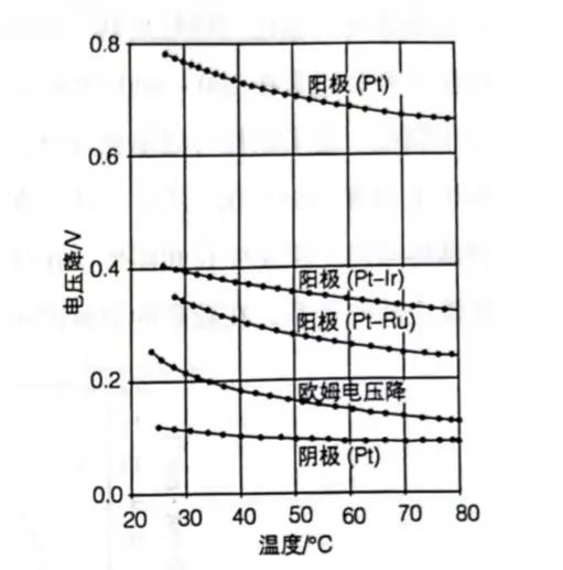图 2 给出了 90 ℃、常压条件下,小室电压与工作电流密度的对应关系。在此温度下,水分解的理论自由能电压约为 1.18 v。实际测量中,spe 的离子电阻及非 mea 构件的电子电阻构成了两项随电流密度线性增加的欧姆损耗;若能将 1 a·cm⁻² 时的电池面电阻控制在 x mω·cm²,则对应的电压损失仅为 x mv。阴极氢析出反应(her)因动力学较快,其过电位 η_h₂ 通常较小;相比之下,阳极氧析出反应(oer)过电位 η_o₂ 明显更高,成为能量损失的主导项。虽然 ruo₂ 的催化活性优于 iro₂,但高电位下 ruo₂ 易被腐蚀失活,因此工业上仍主要采用 iro₂,而 pt 的 oer 活性最差。