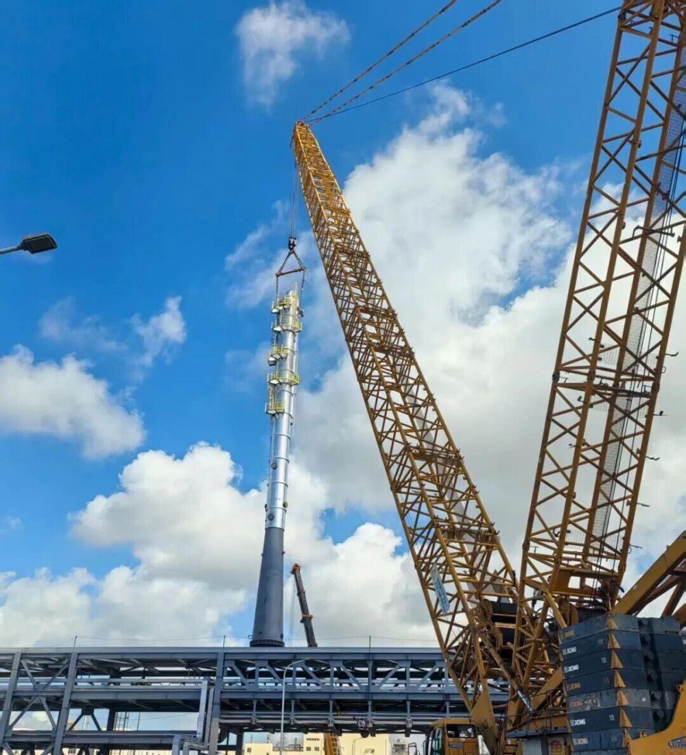 由于项目用地受限,本次吊装需从预制区横跨老厂主管廊至安装位置,作业难度较大。项目部牵头联合体团队,科学编制吊装方案,精心统筹设备进场、“穿衣戴帽” 及大件吊装等关键环节,历时 12 天完成四台精馏塔的附塔管线、梯子平台安装及防腐保温工作。作业中采用 650 吨履带吊车与 300 吨汽车溜尾吊车协同作业,成功跨越老厂主管廊,顺利完成四台精馏塔吊装就位,实现 “塔起灯亮”,为项目全面开展安装施工筑牢坚实基础,赢得业主高度认可与肯定。