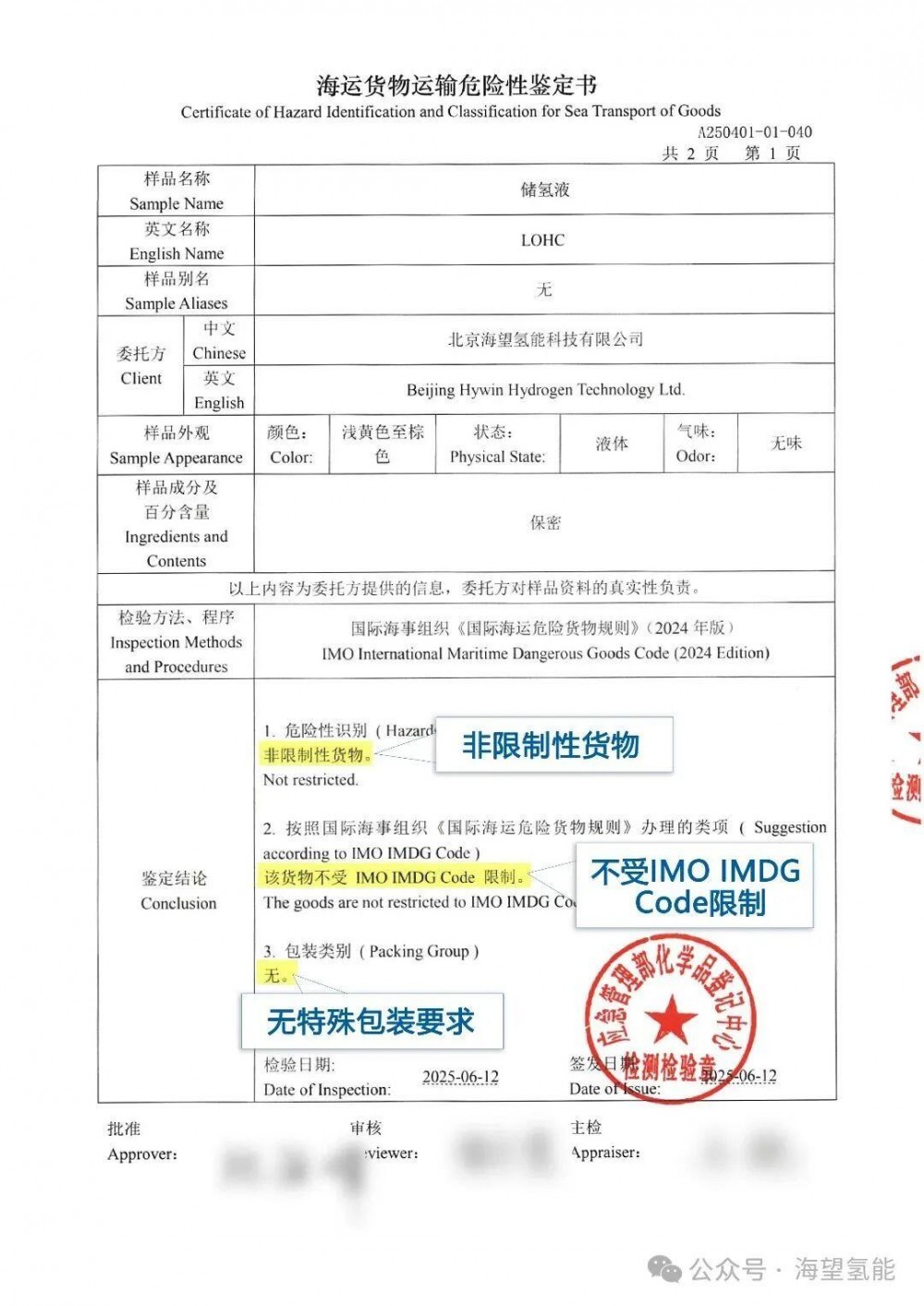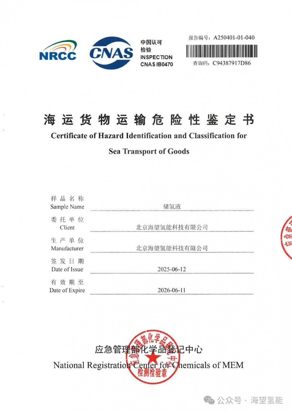 海望储氢液(含贫氢液与富氢液)均为非危化品,可在常温常压下存储,不易燃、不易爆且不易挥发,火灾风险等级仅为丙b类。经应急管理部化学品登记中心依据《国际海运危险货物规则》(imdg code)鉴定,储氢液被归类为“非限制性货物”,无需特殊包装即可运输。
