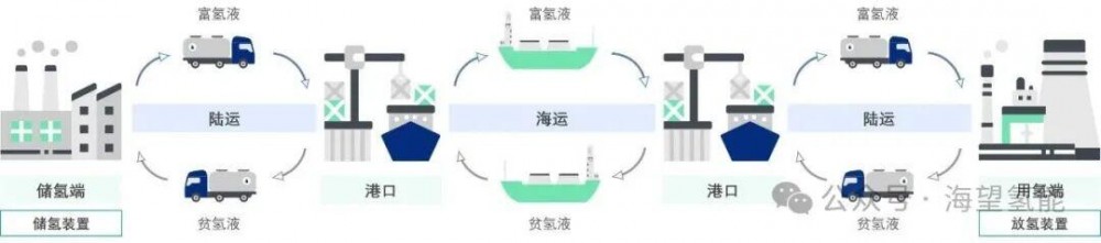 富氢液通过陆运或管道到达港口存储,再经由船舶完成跨海运输。