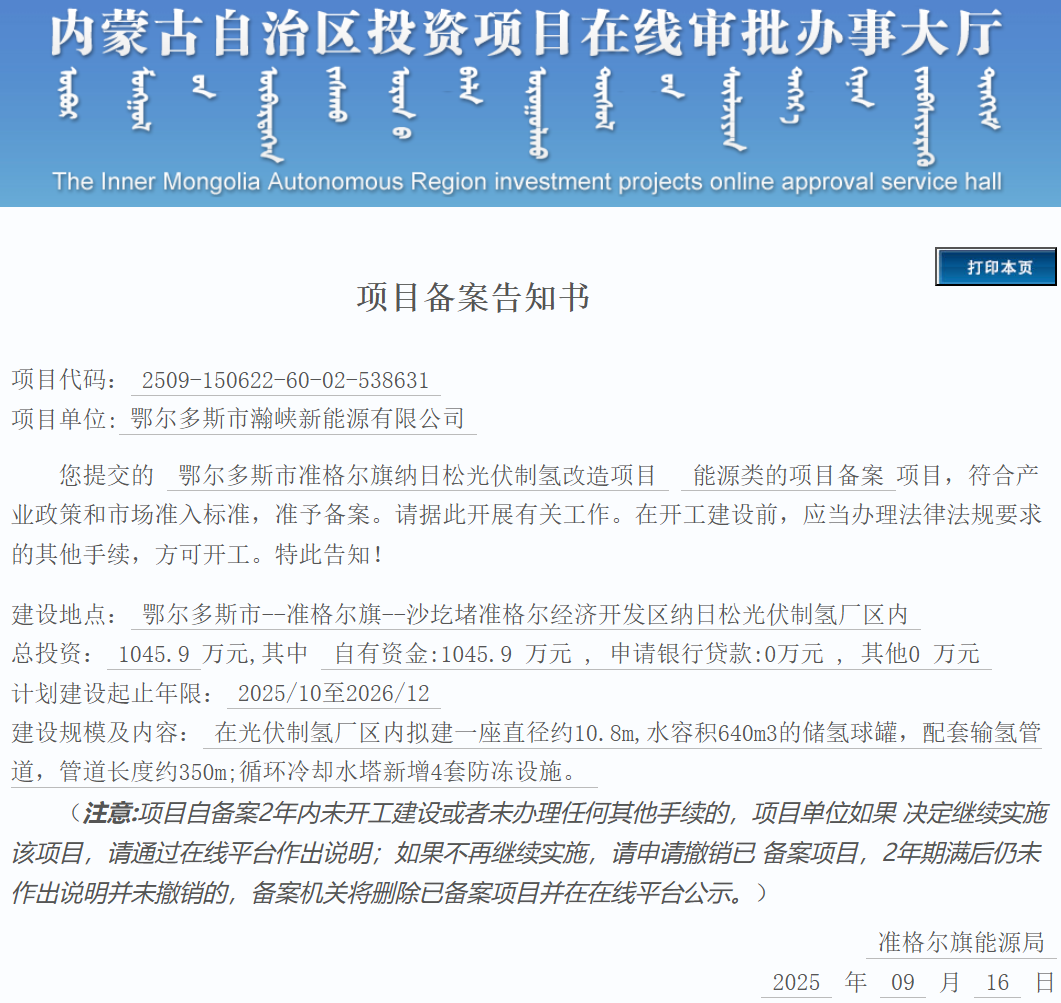 能源圈获悉,近日,鄂尔多斯市准格尔旗纳日松光伏制氢改造项目获备案。