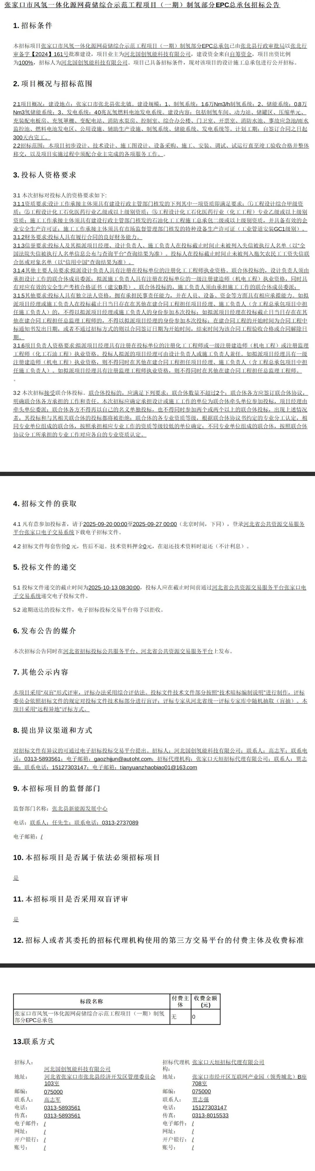 能源圈获悉,9月19日,张家口市风氢一体化源网荷储综合示范工程项目(一期)制氢部分epc总承包招标公告。
