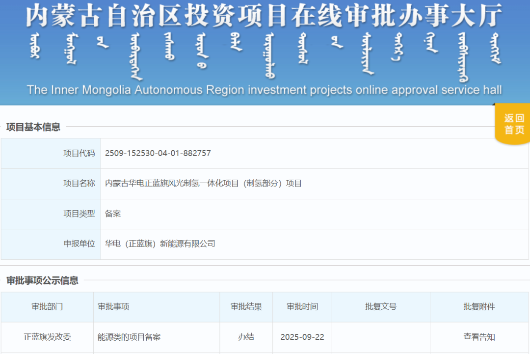 能源圈获悉,9月22日,内蒙古华电正蓝旗风光制氢一体化项目(制氢部分)项目获备案。