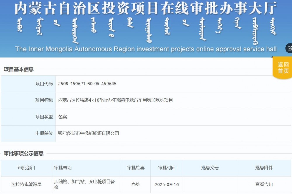 近日,内蒙古达拉特旗4×10⁷nm³/年燃料电池汽车用氢加氢站项目获备案。