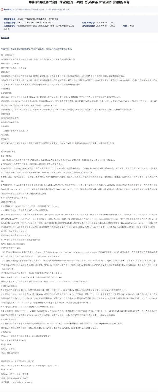 能源圈获悉,9月25日,中能建松原氢能产业园(绿色氢氨醇一体化)总承包项目冬季施工采购,9月23日,该项目氮气压缩机设备招标。