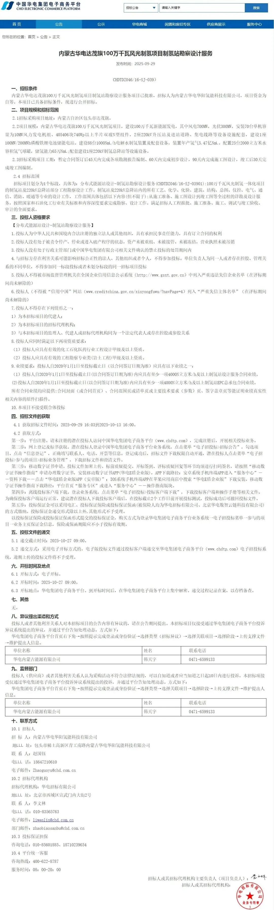 能源圈获悉,9月29日,内蒙古华电达茂旗100万千瓦风光制氢项目制氢站勘察设计服务招标。