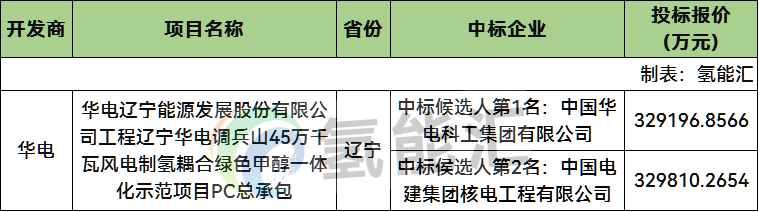 华电辽宁能源有限公司辽宁华电调兵山45万千瓦风电制氢耦合绿色甲醇一体化示范项目pc总承包项目中标候选人公示通知