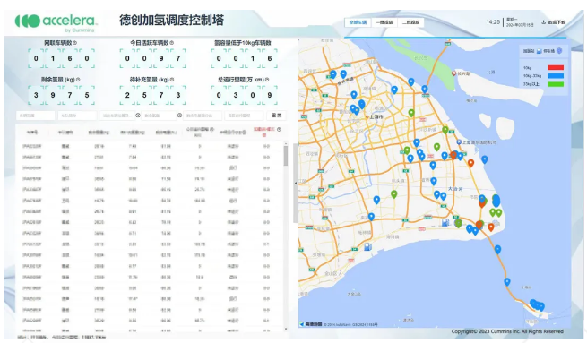 为了更高效地利用加氢站资源,德创未来与康明斯accelera组建专属项目运营团队,实现车队运行状况可视化,用大数据驱动加氢调度,保障车队与加氢站之间高度协同,做到“人歇车不歇”,为氢燃料电池渣土车提供专属加氢通道,保障车队运营。
