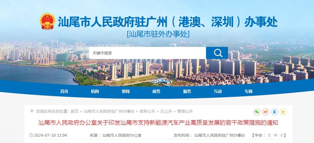 2024年7月10日,汕尾市人民政府印发《汕尾市支持新能源汽车产业高质量发展的若干政策措施》的通知。