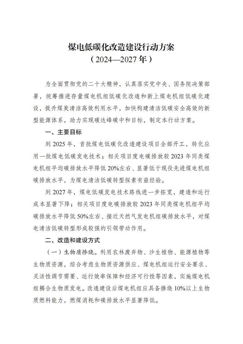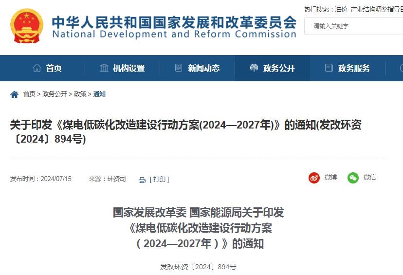 2024年7月15日,国家发改委印发《煤电低碳化改造建设行动方案(2024—2027年)》的通知。