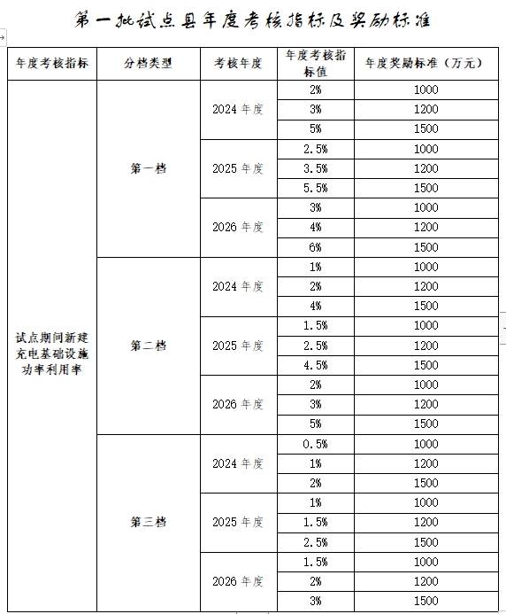 中央财政对经三部门同意备案且完成任务目标的试点县给予奖励资金支持,每个试点县示范期为3年。奖励标准根据每年度试点县充换电设施功率利用率达标情况设置,共分为三个档次。示范期内,每年均达到最高目标的试点县最多可获得4500万元(具体年度考核指标及奖励标准见附件3)。