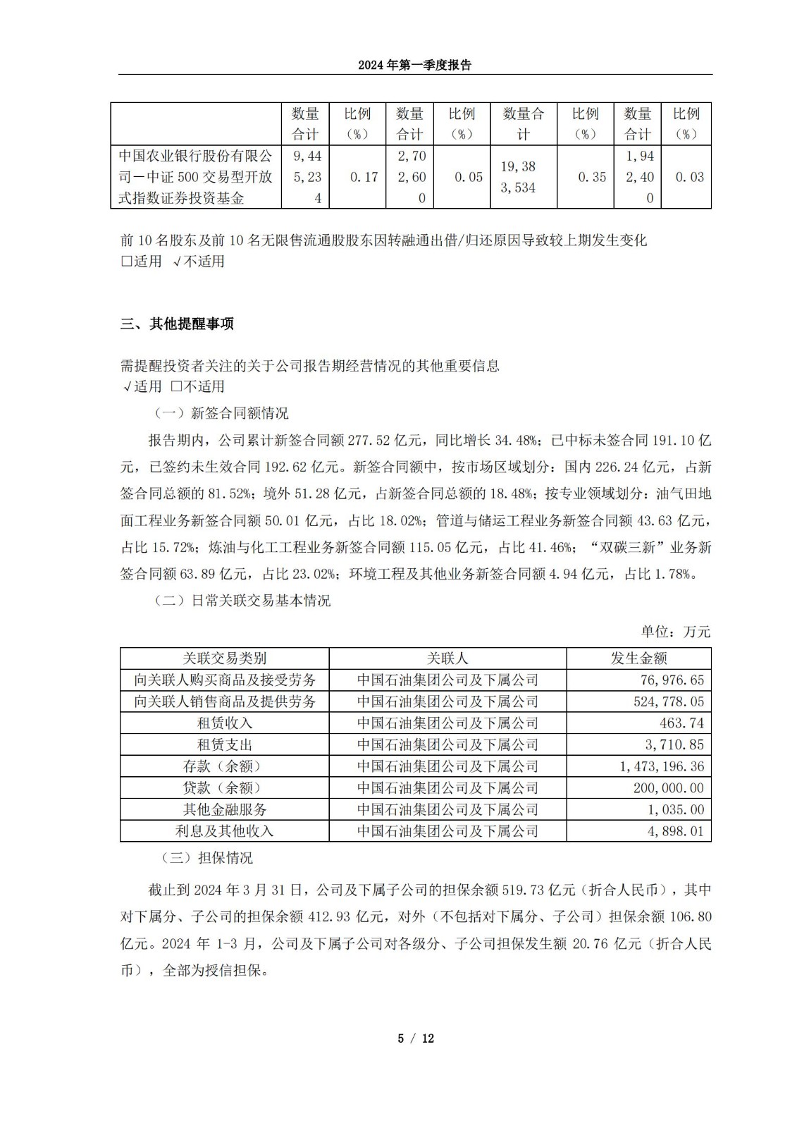 一季度,中油工程实现营业收入147.33亿元、同比下降1.71%,实现毛利13.21亿元、同比减少1.15亿元,主要系公司在执行重点项目“宽周期”内所处阶段变化,导致确认工作量出现小幅波动。发生管理费用5.99亿元,同比减少0.46亿元,主要系公司严控非生产性支出,持续压降销售和管理费用;发生财务费用-0.44亿元,同比减少0.71亿元,主要系受美元等汇率波动影响,形成汇兑净收益0.20亿元,同比增加0.60亿元;发生所得税费用1.24亿元,同比减少0.33亿元,主要系中东伊拉克地区部分工程项目本期预缴所得税同比减少0.35亿元。